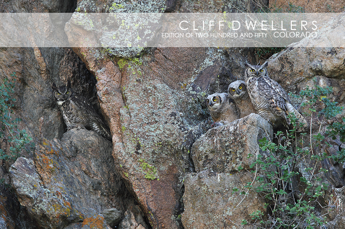 Four great horned owls sit atop a high cliff ledge which serves as their nest and home in the spring and early summer months while the male and female owl raise their young. Living on a cliff gave me the unique opportunity to photograph all four of the owls in one image. Something that is almost impossible when owls take up their usual home in trees. Owls hunt at night and sleep during the day so getting an image where all four were near the nest was quite tricky. It took 5 days of waiting before I captured them all with their eyes open and in a position that worked well for a photo. The owlets pictured here were growing wary of their cliffside home and were already flapping their wings restlessly. About a week after I made this image the young ones fledged and went off on their own.