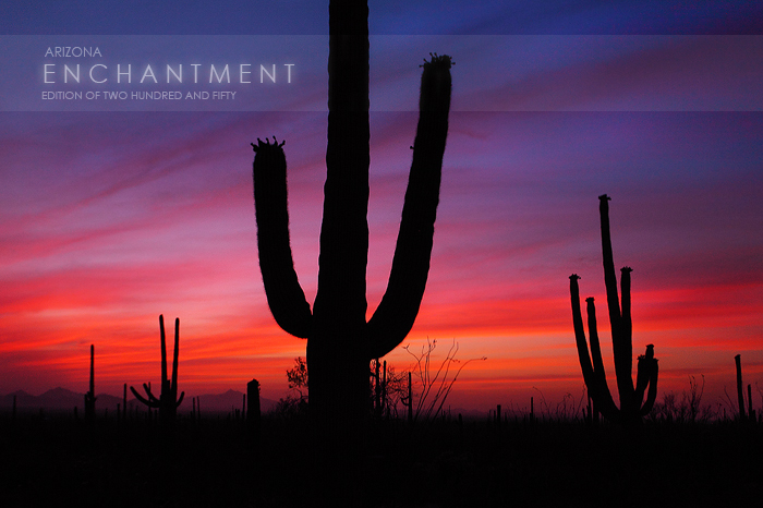 The shapes silhouetted against the fiery skies are unmistakeable. Saguaro Cactuses live in the Sonoran Desert which makes up only a small portion of desert land in the United States, occupying a small part of South-East California, South and Southwest Arizona and parts of Mexico. Yet you have no doubt seen these colossal plants in tv shows, movies, logos and anywhere else the desert is being depicted. Saguaros have come to serve as the universal symbol of the Desert Southwest. I would credit this to their conspicuous nature and their almost human like attributes. Saguaros grow in all different shapes and sizes, but for this image I spent a lot of time searching for a scene that would be dominated by a very classic looking two armed cactus. Luckily I was also awarded an absoultely amazing sunset which allowed me to create this timeless image.