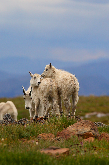 A summer thunderstorm rolls through the mountains, but two mountain goat kids pay no attention as they go about their day grazing and playing with each other. These animals spend most of their lives at extremely high elevations, so rain or shine, the short summer months are a luxury for them.