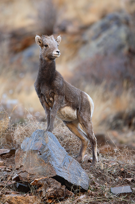 A young bighorn sheep lamb uses the aid of a large rock to get a better perspective of its surroundings.