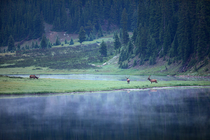 A trio of bull elk graze on grasses on a cool summer morning. This was one of those mornings, before the sun rose where everything was so perfectly still and quiet. There's nothing like that time of day.